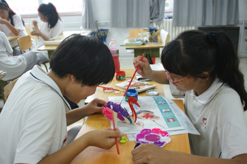 除了特色社团课程外,实践团成员们还为同学们设置了手工制作课。课堂上,同学们自觉分成小组,制作立体木质拼图。同学们在接过模板之后迫不及待地开始制作,按照说明认真拼接每一块木板,实践团部分成员也加入各个小组一起制作拼图。制作完成后,同学们用颜料将作品涂上颜色,虽然大家个个手上都沾满了颜料,脸上却洋溢着幸福的笑容。
