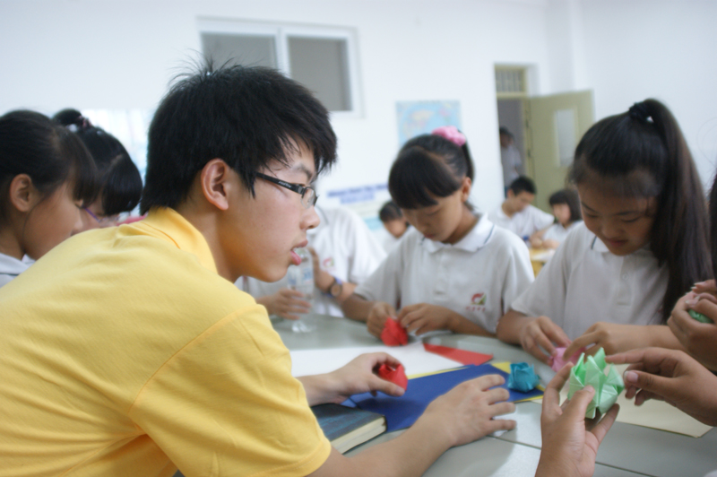 除一系列具有英语特色课程之外,实践团成员们还为同学们准备折纸、POP艺术字等多项培养同学们动手能力、创造能力、思维能力的艺术课程。课堂上,驰骋在绿茵场上的足球健将纪杰化身心灵手巧的折纸老师,带领同学们学习纸玫瑰的折叠方法,深受同学们喜爱。宣传骨干陈昱茜则变身为引领同学们在艺术中畅游的艺术字老师,教授同学们POP艺术字的写法。同学们在老师的指导下,亲手完成艺术作品,互相展示,课堂上热闹非凡,不同的脸庞相似的笑脸将成为美好的回忆。