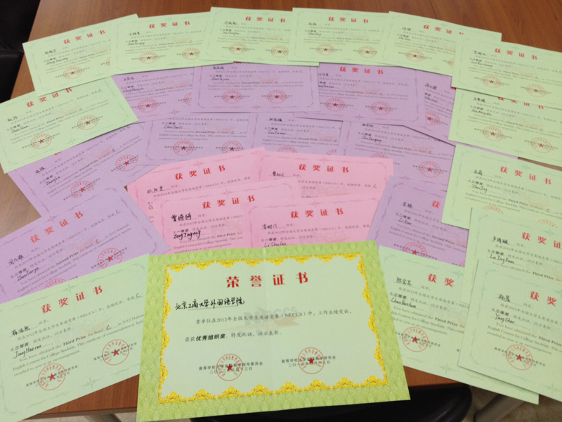 2012年全国大学生英语竞赛(NECCS)成绩近日揭晓,我校4人荣获全国一等奖,10人荣获二等奖,20人荣获三等奖,我校外国语学院获得优秀组织奖,4名教师荣获优秀指导教师。其中,信息092欧阳雯获C类一等奖,指导教师范燕燕;食品学院应化092曾婷婷获C类一等奖,指导教师陶爽;计信学院自动092李树凡获C类一等奖,指导教师陈秀珍;食品学院生物092曹知之获C类一等奖,指导教师石洪宇。6月28日上午,外国语学院副院长张卫晴、教学秘书王雪松以及外国语学院团总支书记张悦为获奖同学颁发了获奖证书。