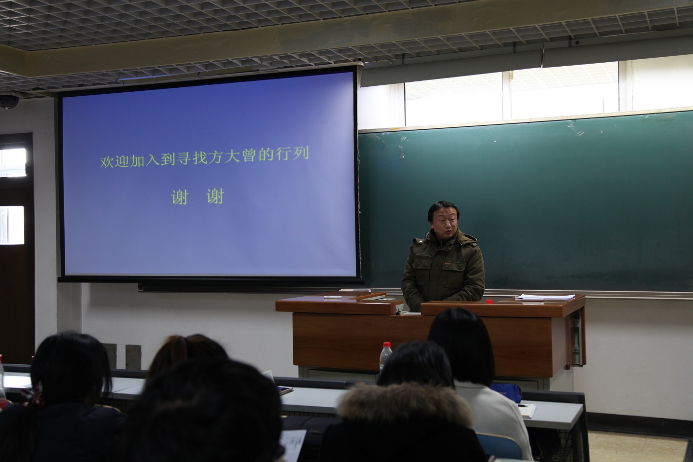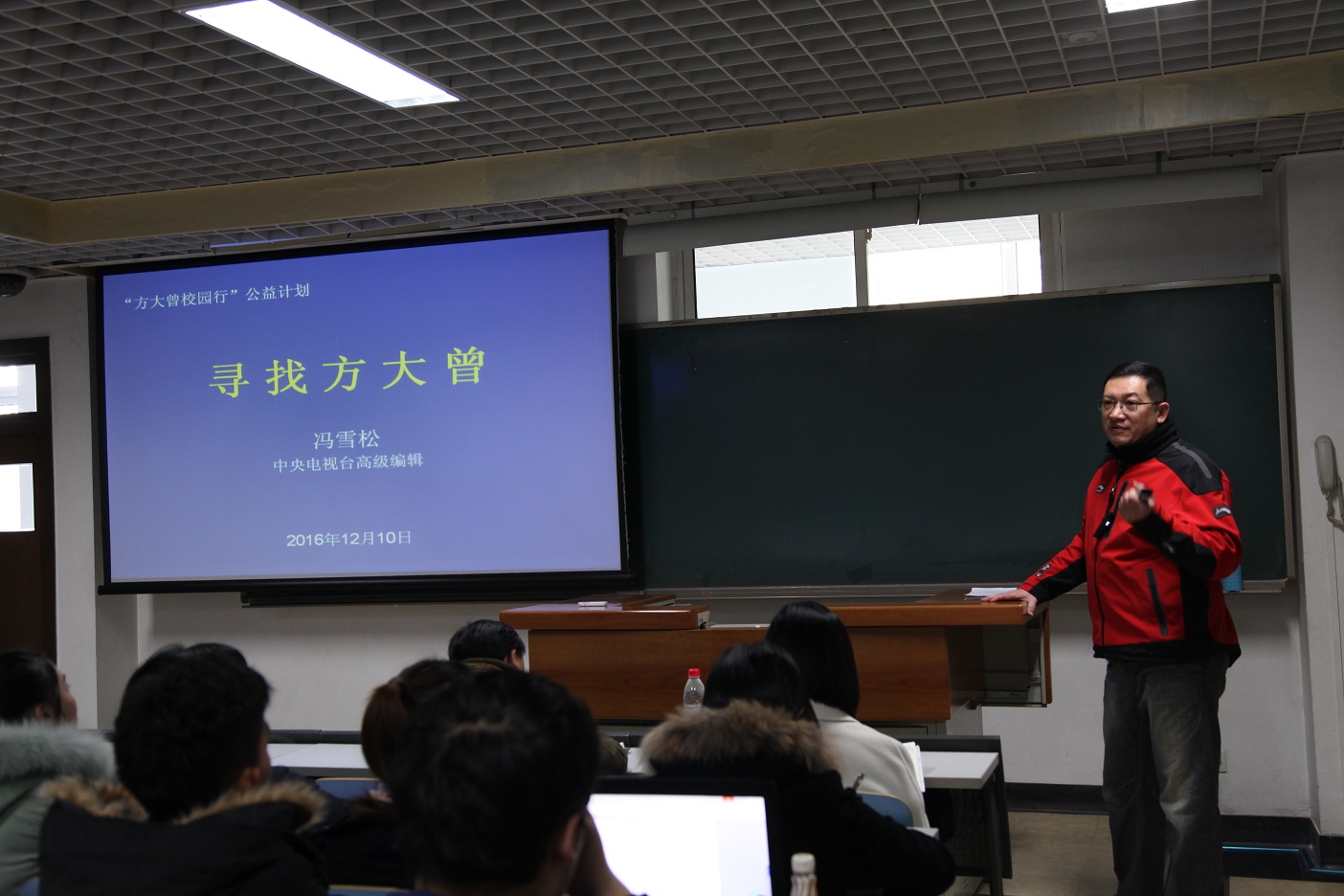 12月10日上午,“寻找方大曾”的“方大曾校园行”公益活动在良乡校区举行,央视高级编辑、纪录片导演冯雪松老师带着方大曾的故事和寻找方大曾的经历走进我院师生中。《人民画报》社长于涛、学院党委书记林刚教授、新闻系副主任范敏老师以及各年级新闻专业学生和学生党员参与了此次讲座,讲座由新闻系李杰琼老师主持。