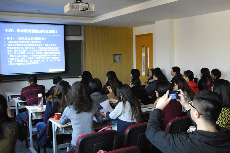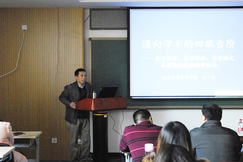王一川教授题为《学术研究的四个台阶》的学术讲座,娓娓道出了学术研究之路:从读书、读书报告、研究论文到课题申报,并通过自己的研究、课题申报亲身经历,提示老师要勇于开拓个人的学术园地,坚持学术研究道路。王教授的讲座以独特的人格魅力、丰博的学识、直爽的人生态度,给艺传学院老师带来深刻启迪。