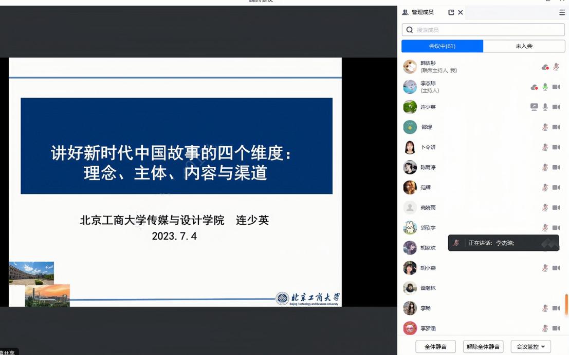 她同时强调,北京市在落实国家文化数字化战略的过程中,坚持科技为文化赋能、文化为城市赋能的发展思路。北京工商大学作为北京市重点建设的高水平研究型大学,致力通过科学研究、人才培养、社会服务支撑首都经济社会高质量发展。积极围绕“文化创意产业的数字化转型”,助力北京建设全国文化中心,这是我校新闻传播学科的又一个鲜明特色。