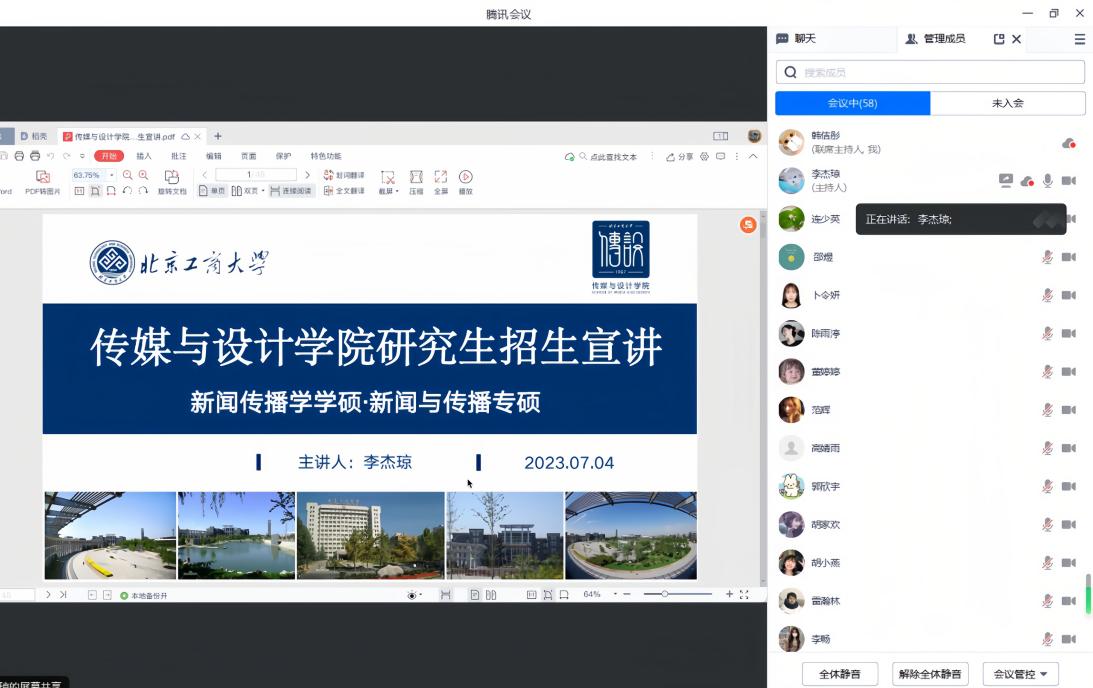 传媒与设计学院副院长李杰琼从学科发展沿革、校内外师资队伍、人才培养模式、学业保障体系四个维度,对北京工商大学新闻传播学学硕、新闻与传播专硕两个学位授权点的优势和特色进行了介绍。她指出,北京工商大学新闻传播学科,有地处北京的地理优势和资源优势,有多学科交叉融通的新文科建设基因,有帮助每一位学生成为更好自己的人文情怀,欢迎全国高校优秀大学生报考我校新闻传播学学硕和新闻与传播专硕。