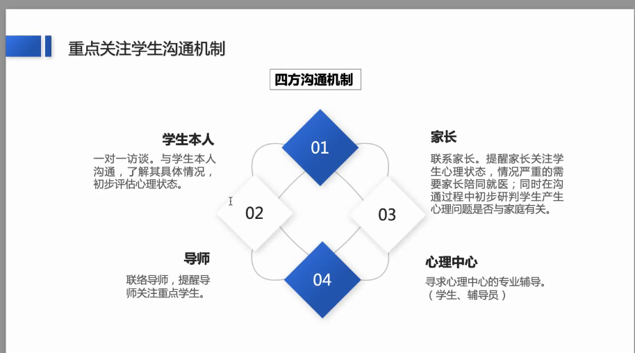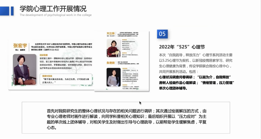研究生辅导员李妍对研究生心理健康教育工作进行了汇报,针对研究生目前存在的心理问题与沟通解决机制进行了详细的阐述,主要通过四方沟通机制帮助学生调整心态,从学生本人、家长、导师和心理中心四方面帮助学生缓解焦虑,举办心理节活动,为学生提供心理团体辅导。