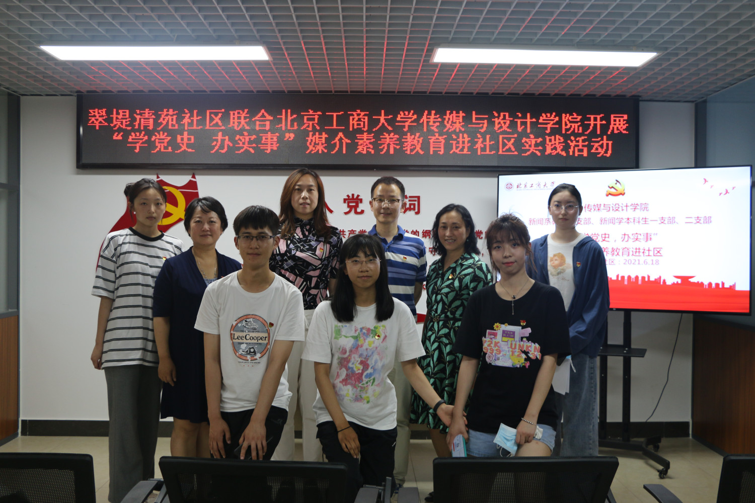 2021年6月18日下午,北京工商大学传媒与设计学院新闻系教师党支部、新闻系本科生学生一支部、二支部前往房山区拱辰街道翠堤清苑社区开展“‘学党史,办实事’媒介素养教育进社区”实践活动。新闻系党员教师罗昶、陈静、许莉、刘超和新闻系18级、19级多位党员本科生与老年朋友们面对面,讲解谣言产生原因、提供谣言识别方法,并组织了问答互动环节。