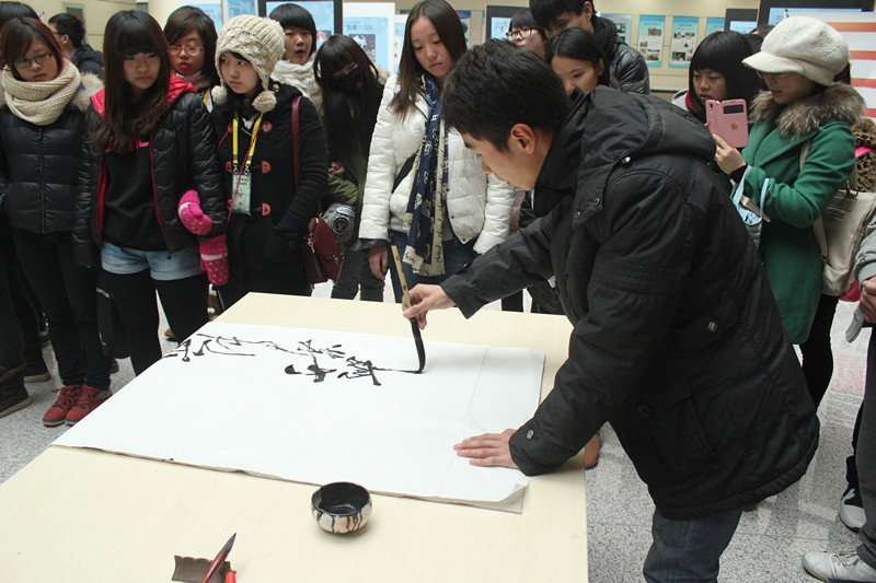 随后,我院4名同学的现场才艺展示成为开幕式的亮点。伴随着琴笛合奏的《雨碎江南》悠扬乐声,两位同学现场挥毫创作出了苍劲有力的书法作品和清新淡雅的水墨画,令在场的师生为之叹服,同学们纷纷表示今后要努力向他们学习。