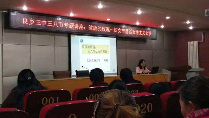 新学期伊始,在三八国际妇女节来临之际,3月7日下午,应北京工商大学附属中学校工会的邀请,艺传学院中文教研室刘莉副教授为该校女教师做了题为“绽放的玫瑰——三八节话女性写作”的专题讲座,开启了我校2016市教委专项“支援地方中小学发展”工作的中文学科建设系列活动。据悉,这也是我校与房山区政府教育合作签约之后的首场学术讲座。来自附中和良乡四中的100余名女教师聆听了本场讲座。