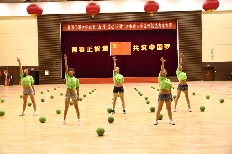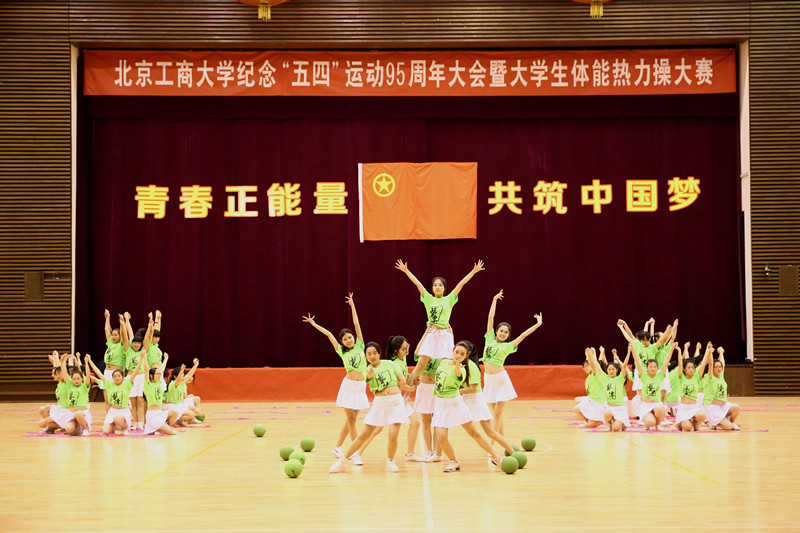 5月4日,“青春正能量,共筑中国梦”北京工商大学纪念“五四”运动95周年大会暨大学生体能热力操大赛在文体馆举行,此次活动持续了两个多小时,在三层的篮球场上,代表各院的队伍相继奉献了精彩的表演,时间随着音乐渐渐流逝,“艺传传奇”的声音在场上霎然响起,看台上亮绿色的院旗与热力操队员“摇摆挥舞”,台上台下共同喊出“艺传传奇,所向无敌,热力似火,青春如我”的口号,在热力操队员137名同学和拉拉队员100名同学共同呼喊下,贯彻这五四的殿堂,青春的战场。