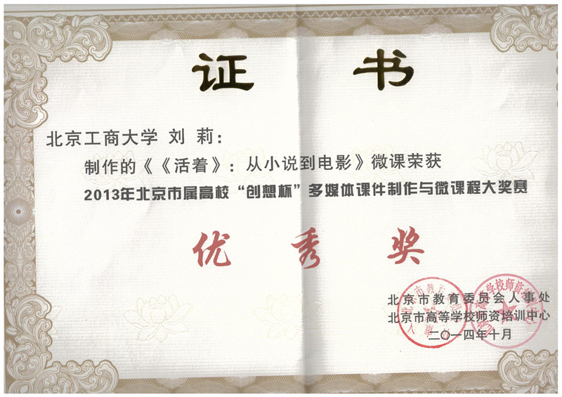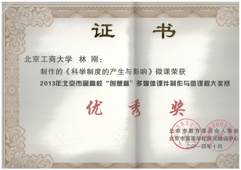 2014年10月30日,北京市教育委员会人事处、北京市高等学校师资培训中心共同隆重举办2013年北京市属高校“创想杯”多媒体课件制作与微课大奖赛的颁奖典礼。我院教师林刚副教授、刘莉副教授获得首届微课比赛的优秀奖。