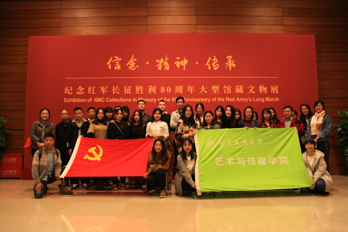 为纪念红军长征胜利80周年,扎实开展“两学一做”教育实践活动,坚定学生党员的共产主义信念,保持党员的先进性,艺术与传媒学院党委组织部分教工党员和学生党员前往参观纪念长征胜利80周年主题展览。10月26日,学院党委副书记刘晶与学生工作党支部教工党员以及学生党员一同前往国家博物馆观看《信念•精神•传承----纪念红军长征胜利80周年大型馆藏文物展》展览。