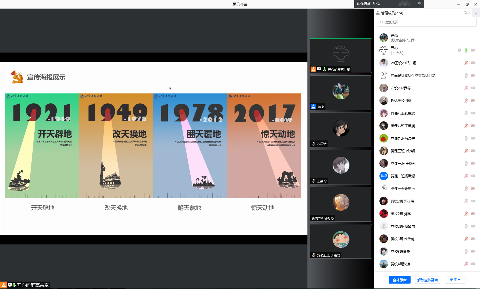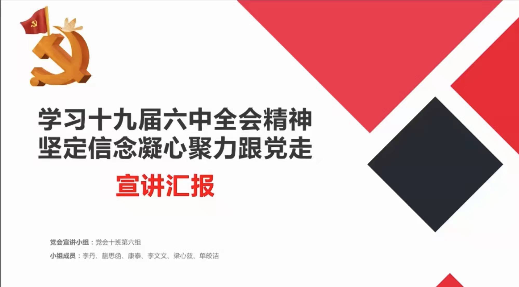 南湖晚风,拂面微凉。分党校学员银曼君、刘源、王佳歧、董译夫为大家带来诗朗诵《百年正青春 青春献给党》,同学们声情并茂地展现了中国共产党百年来栉风沐雨的光辉历程。中国共产党历经百年,恰似风华正茂,将继续扬帆新启航,全面开启新征程!党校十班第六组李丹同学以“学习十九届六中全会精神,坚定信念凝心聚力跟党走”的宣讲汇报,详细讲述中国共产党取得的重大历史成就,结合专业知识分享了小组海报设计理念,运用电影的镜头语言和二维化的手段,添加重大历史事件元素,展现中国共产党百年来初心不忘,带领人民从站起来到富起来再到强起来的伟大历程。