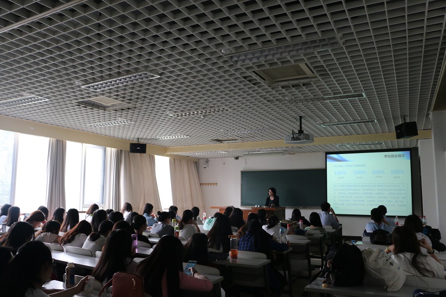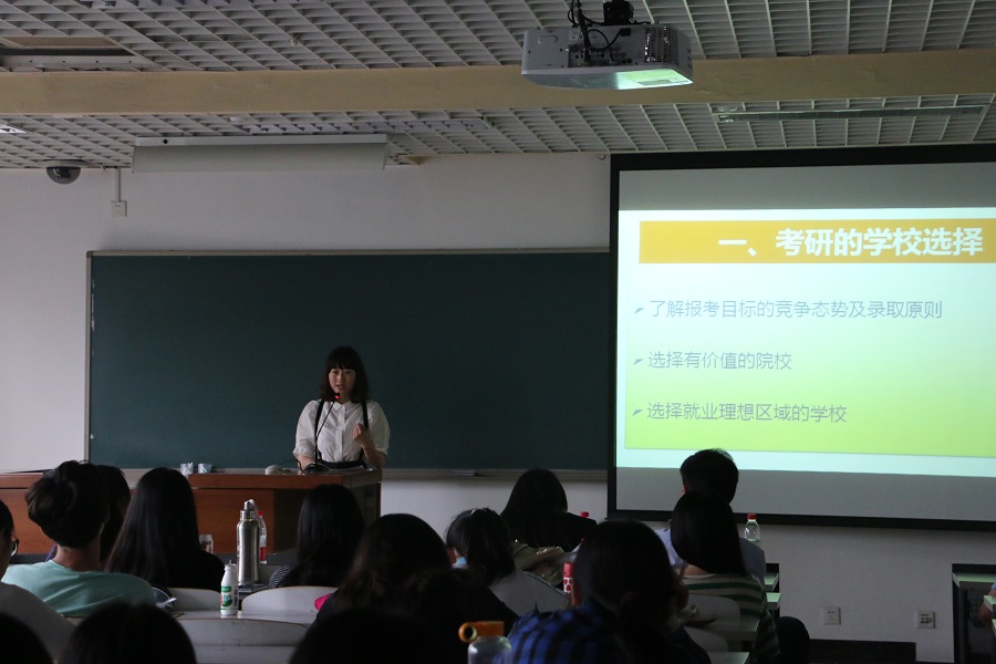 新闻系老师李杰琼针对近年研究生报名录取情况、2016年全国研究生招生数据调查报告、学术硕士与专业硕士的比较、考研准备与日程规划四个方面做了详细介绍,建议同学们明确自己的职业生涯规划,选择适合自己的,可实现程度最大的考研目标。广告系李峤雪老师向同学们阐述了考研的学校选择、考研的复习建议以及考研的心态准备三方面的内容。